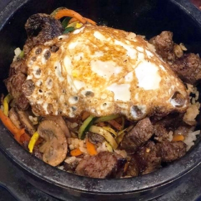 Rice in Stone Bowl, topped with Pan-Fried Chicken, with Sauteed Vegetables, and a fried egg sizzle with a Spicy Asian Miso Sauce